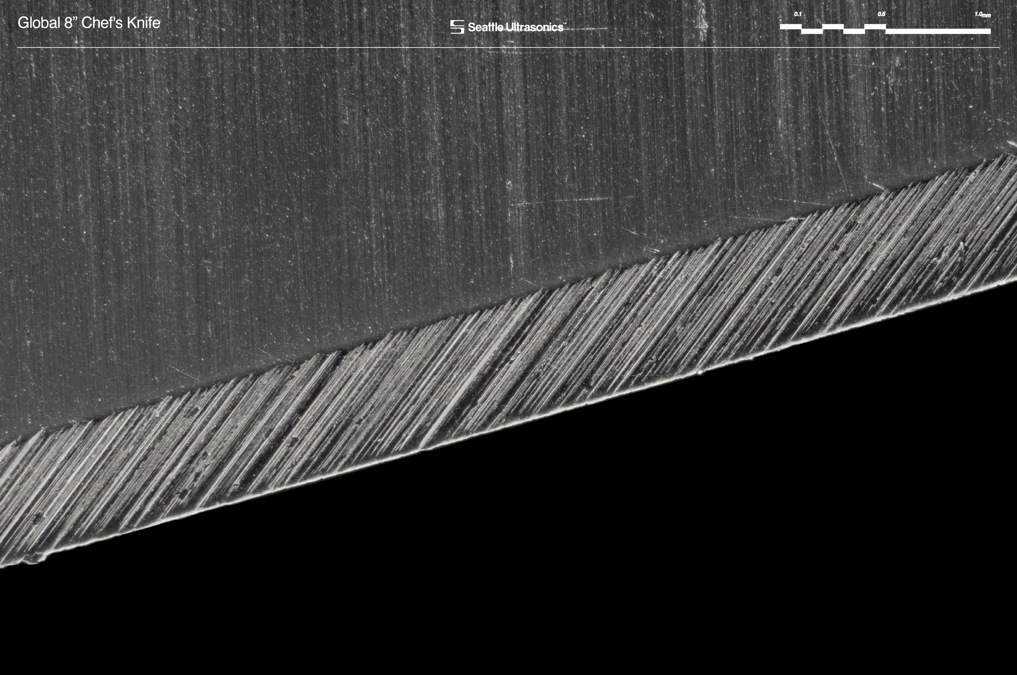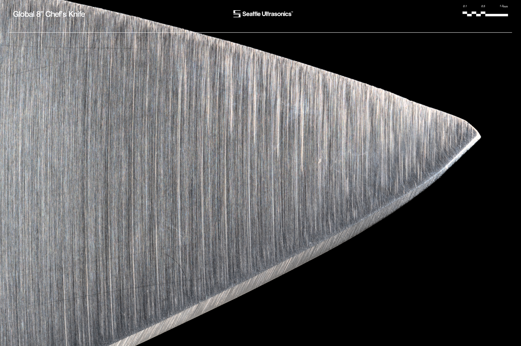 Each knife was photographed before use at high-magnification. These reveal features that indicate the quality of the blade’s construction, like the sharpness of the tip, the straightness of the choil, the evenness of the apex, and the smoothness of the sharpened edge. Learn more