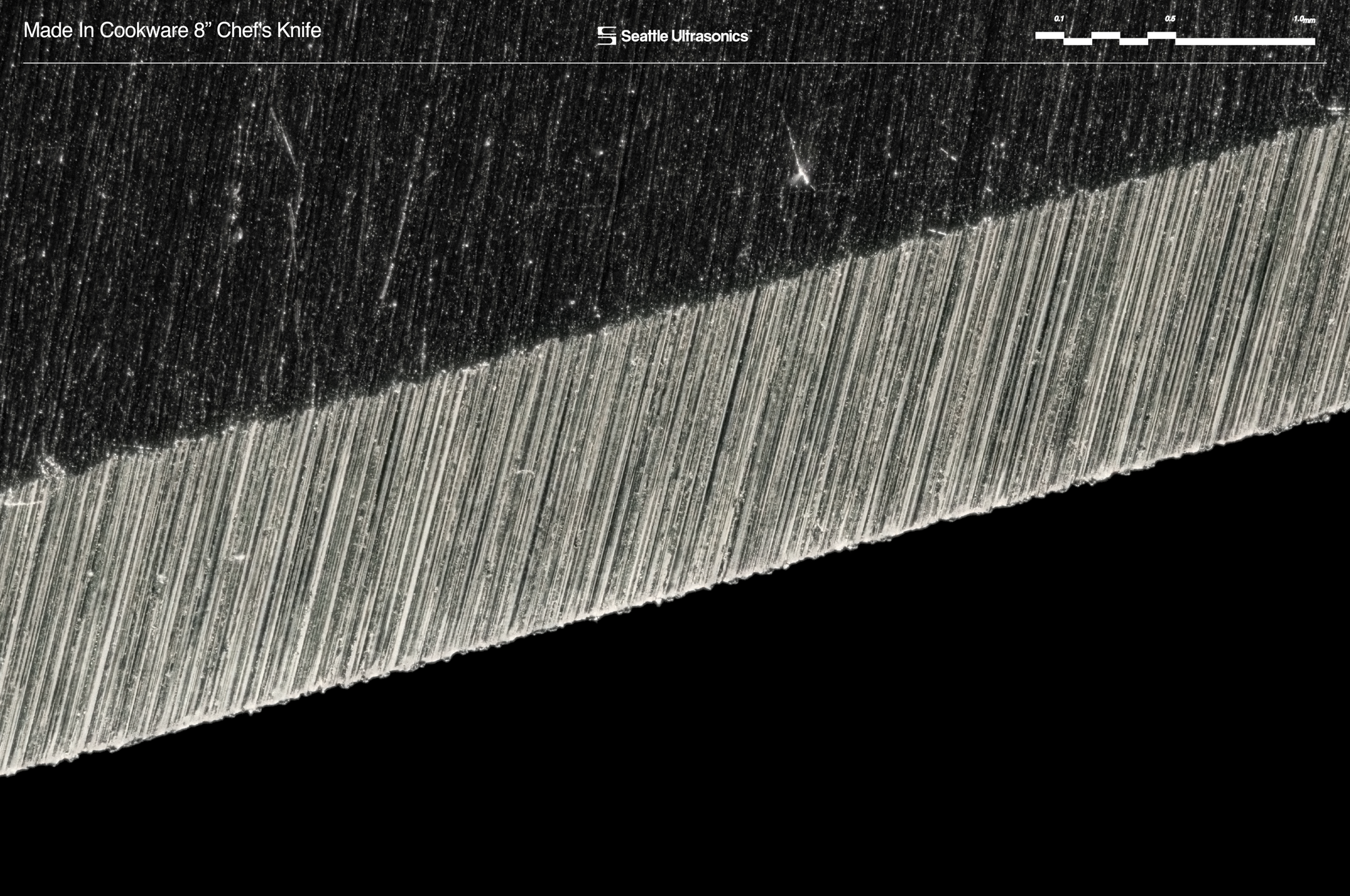 Each knife was photographed before use at high-magnification. These reveal features that indicate the quality of the blade’s construction, like the sharpness of the tip, the straightness of the choil, the evenness of the apex, and the smoothness of the sharpened edge. Learn more