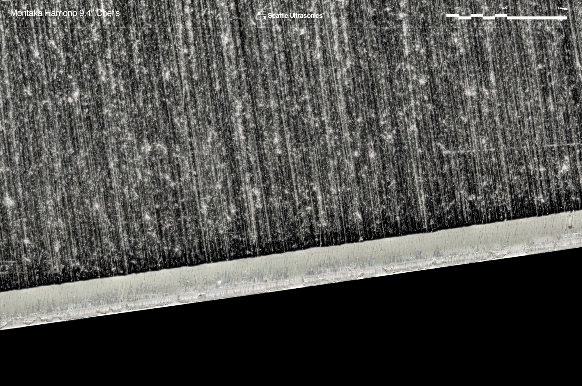 Each knife was photographed before use at high-magnification. These reveal features that indicate the quality of the blade’s construction, like the sharpness of the tip, the straightness of the choil, the evenness of the apex, and the smoothness of the sharpened edge. Learn more