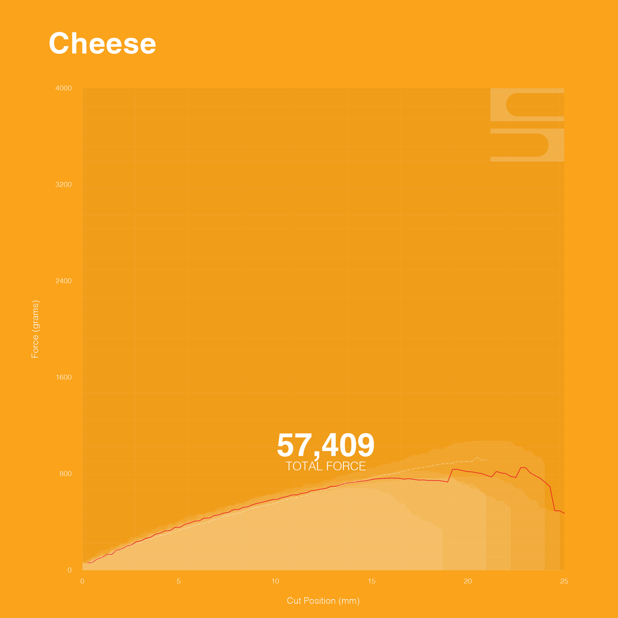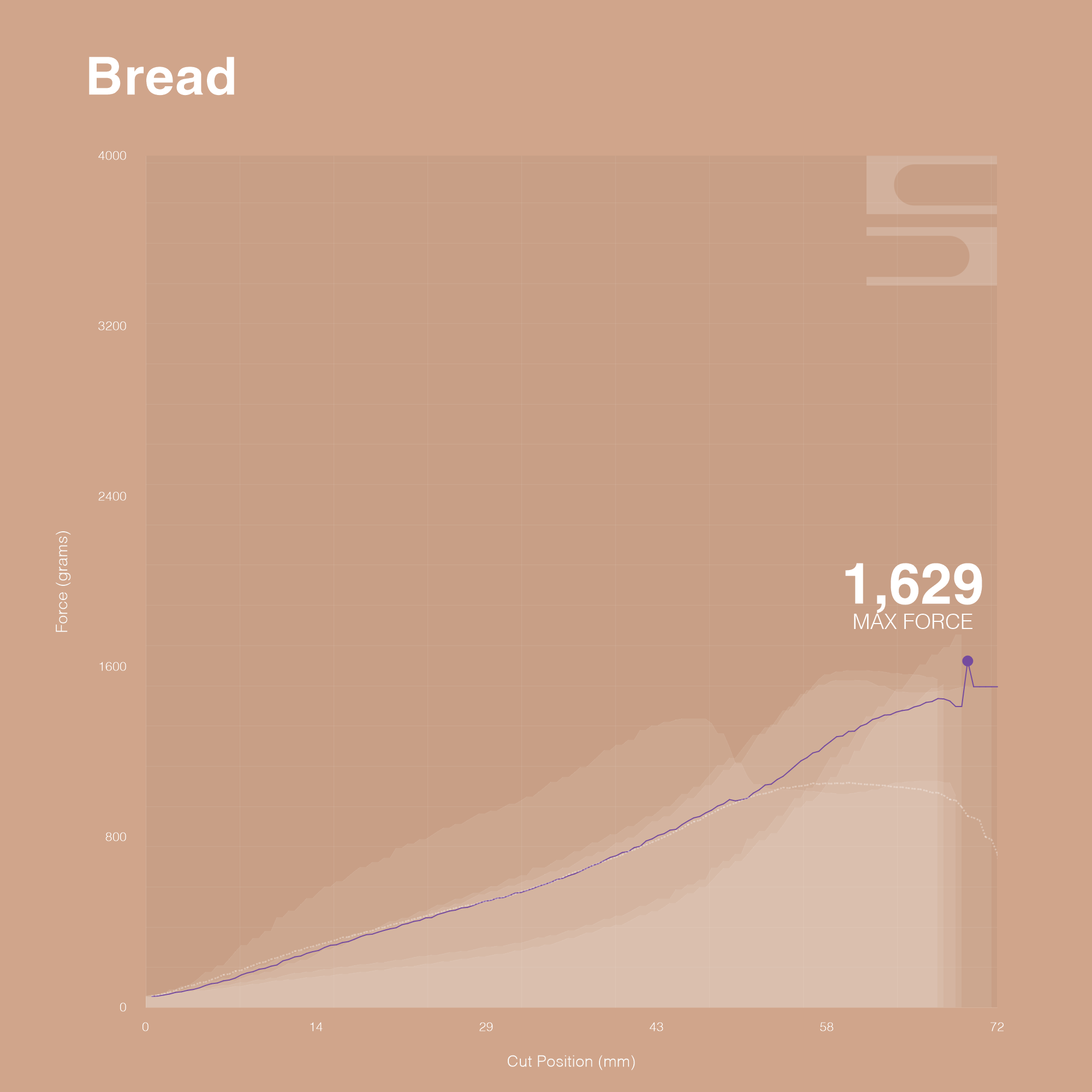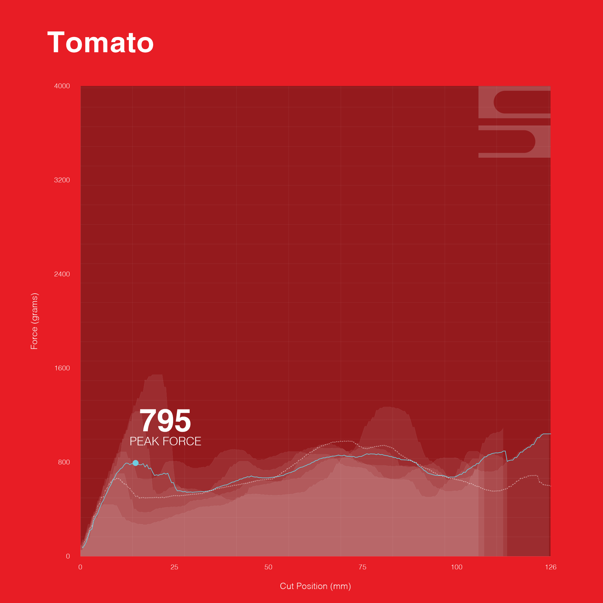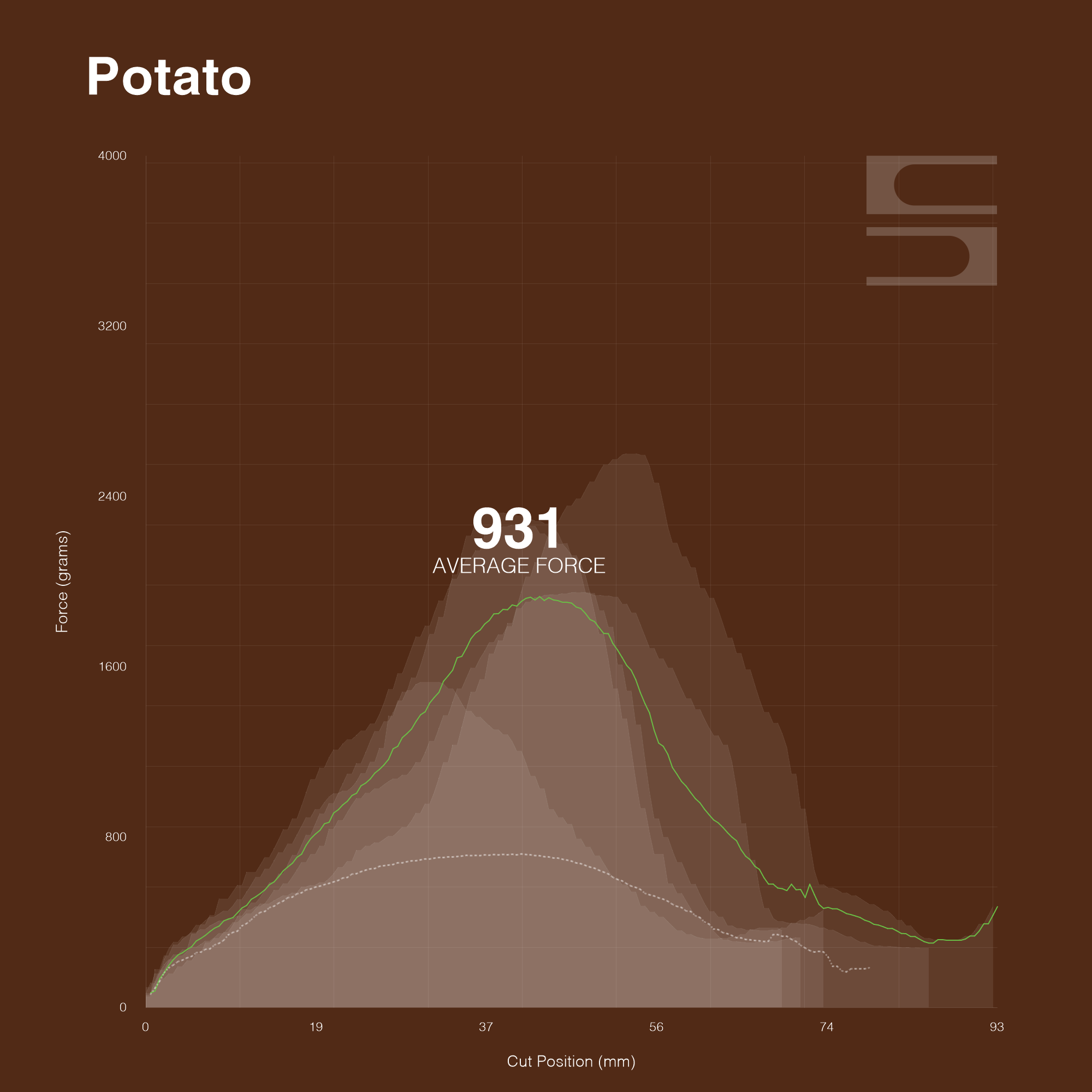 These charts show the forces required to cut through each of these foods. Each chart contains five trials for this knife, overlaid on one another. The five trials are summarized with a dotted, colored average line, and are compared against the best performing knife in the collection, shown as a dotted white line. Learn more