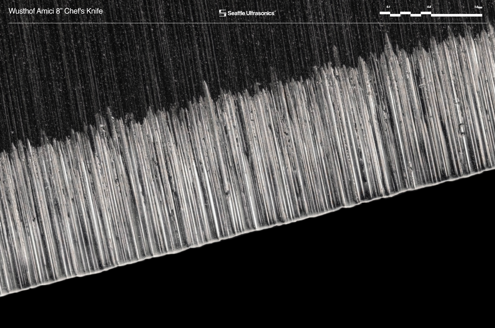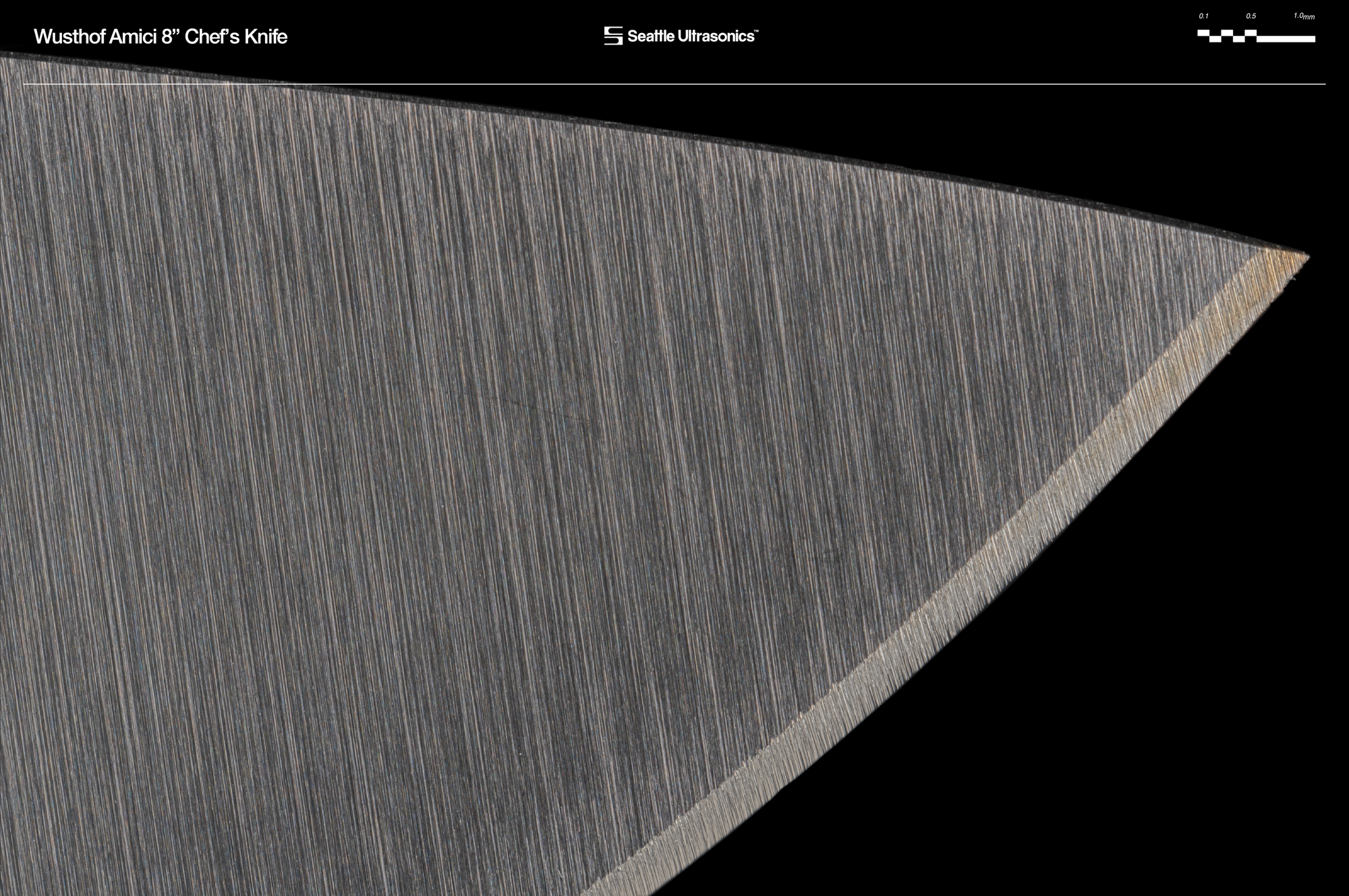 Each knife was photographed before use at high-magnification. These reveal features that indicate the quality of the blade’s construction, like the sharpness of the tip, the straightness of the choil, the evenness of the apex, and the smoothness of the sharpened edge. Learn more