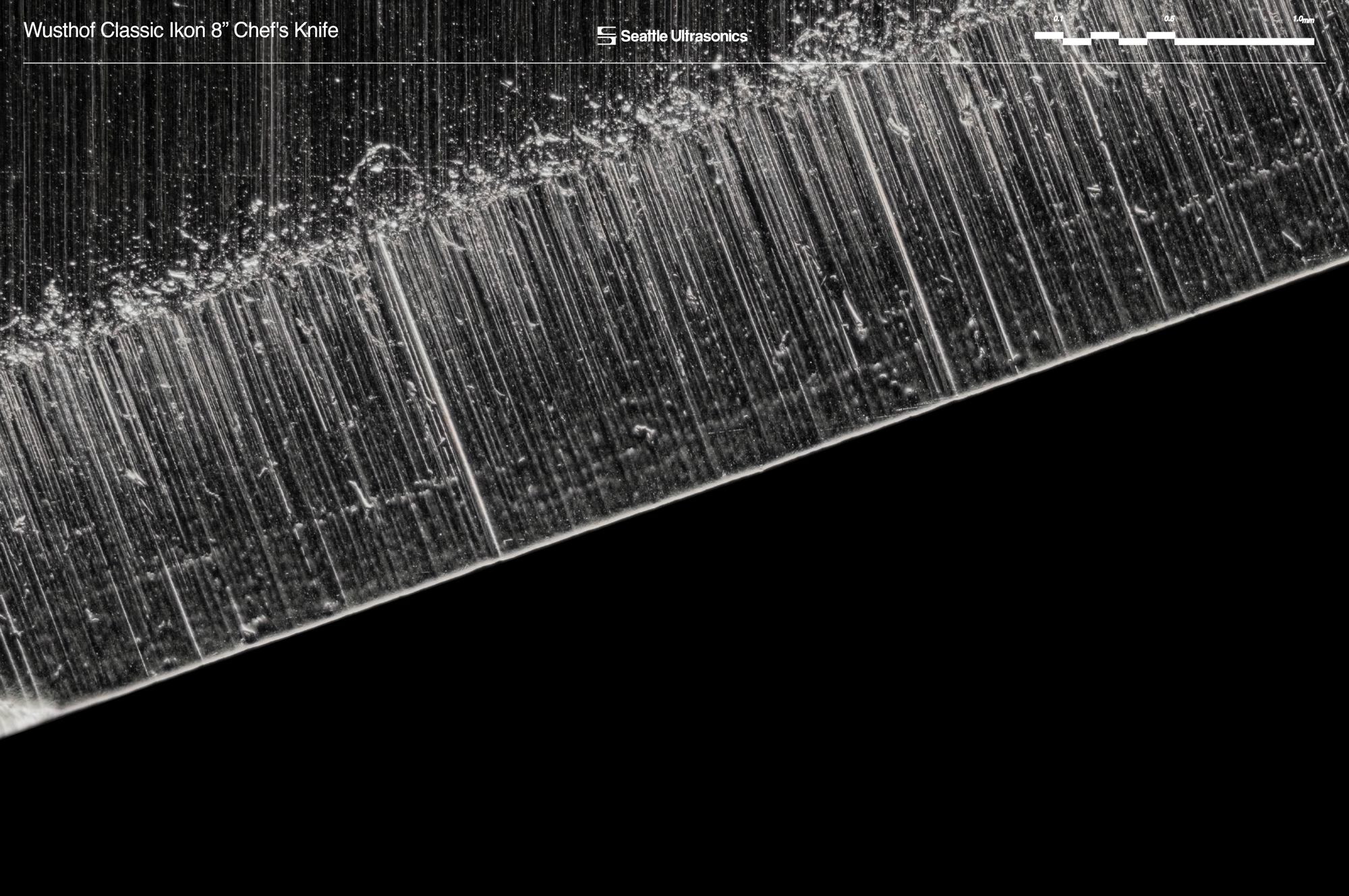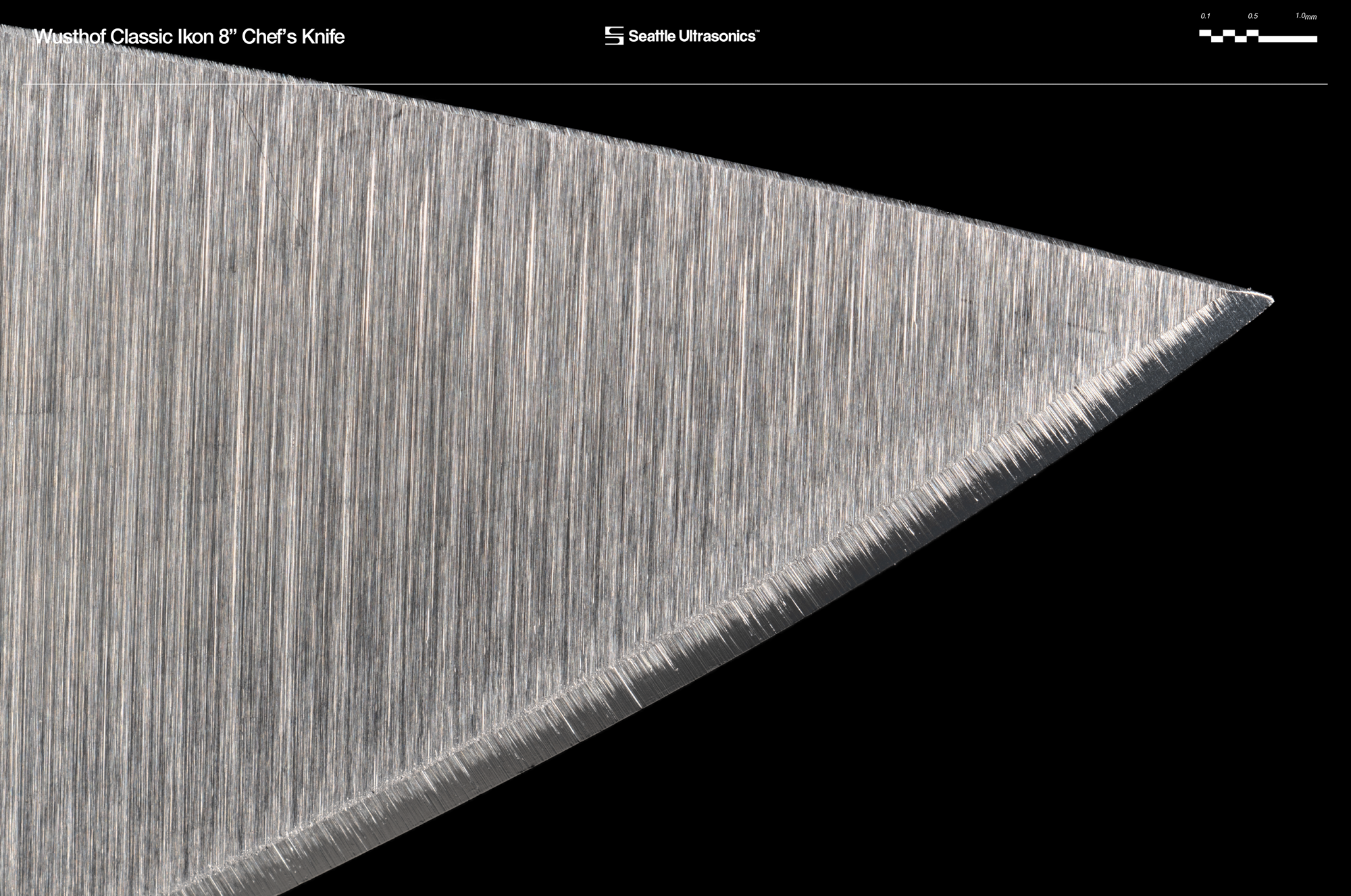 Each knife was photographed before use at high-magnification. These reveal features that indicate the quality of the blade’s construction, like the sharpness of the tip, the straightness of the choil, the evenness of the apex, and the smoothness of the sharpened edge. Learn more