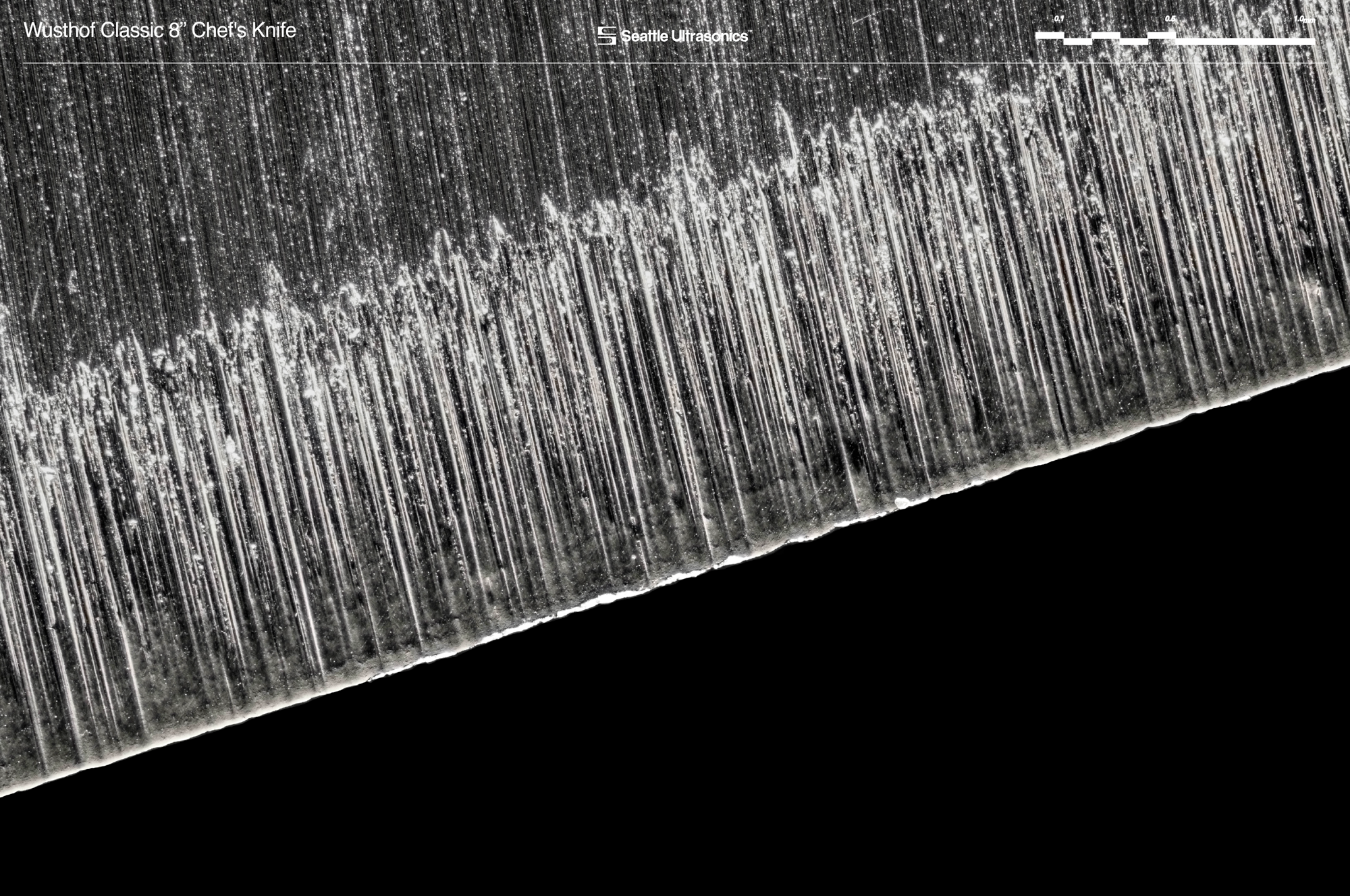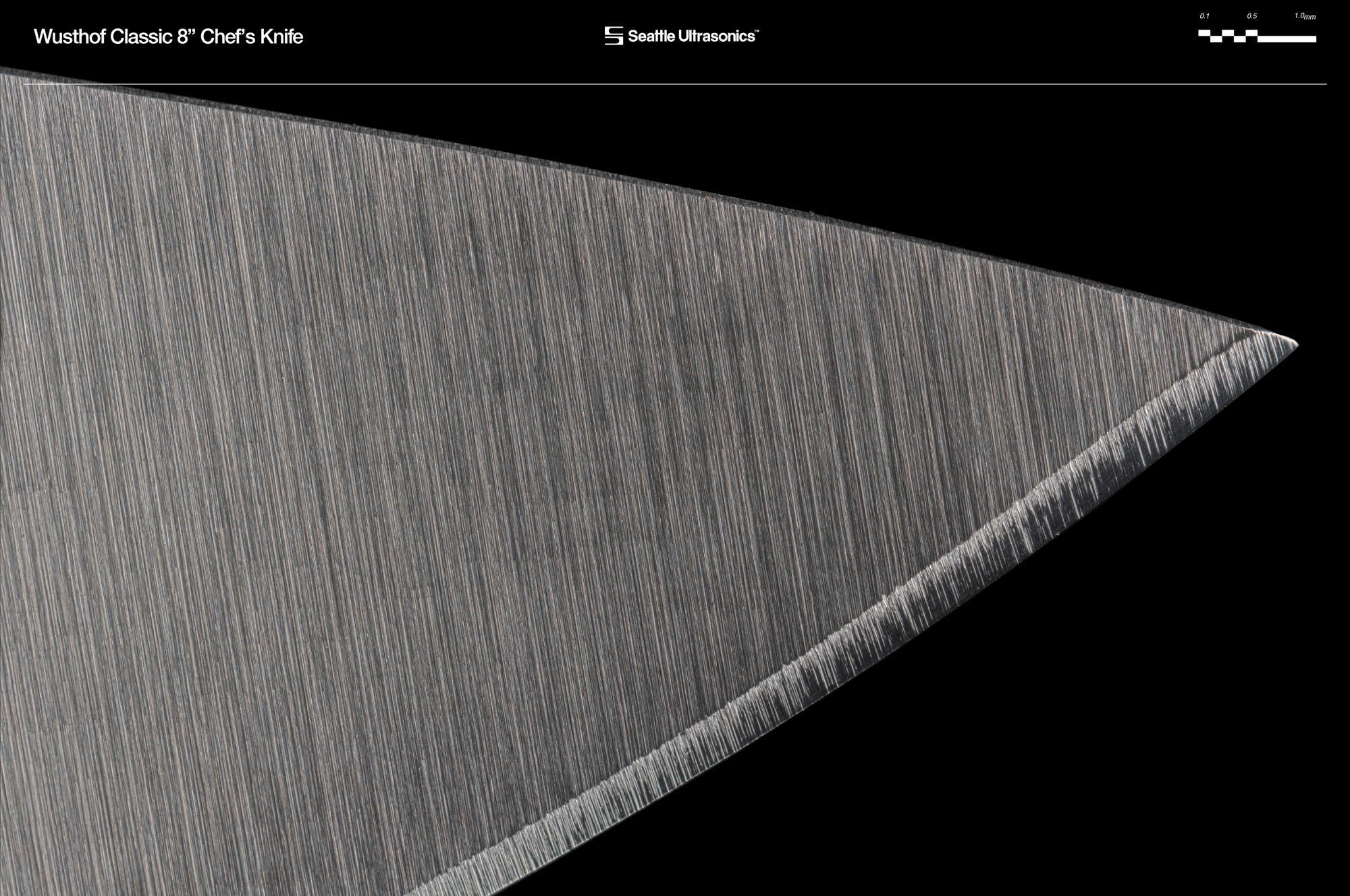 Each knife was photographed before use at high-magnification. These reveal features that indicate the quality of the blade’s construction, like the sharpness of the tip, the straightness of the choil, the evenness of the apex, and the smoothness of the sharpened edge. Learn more