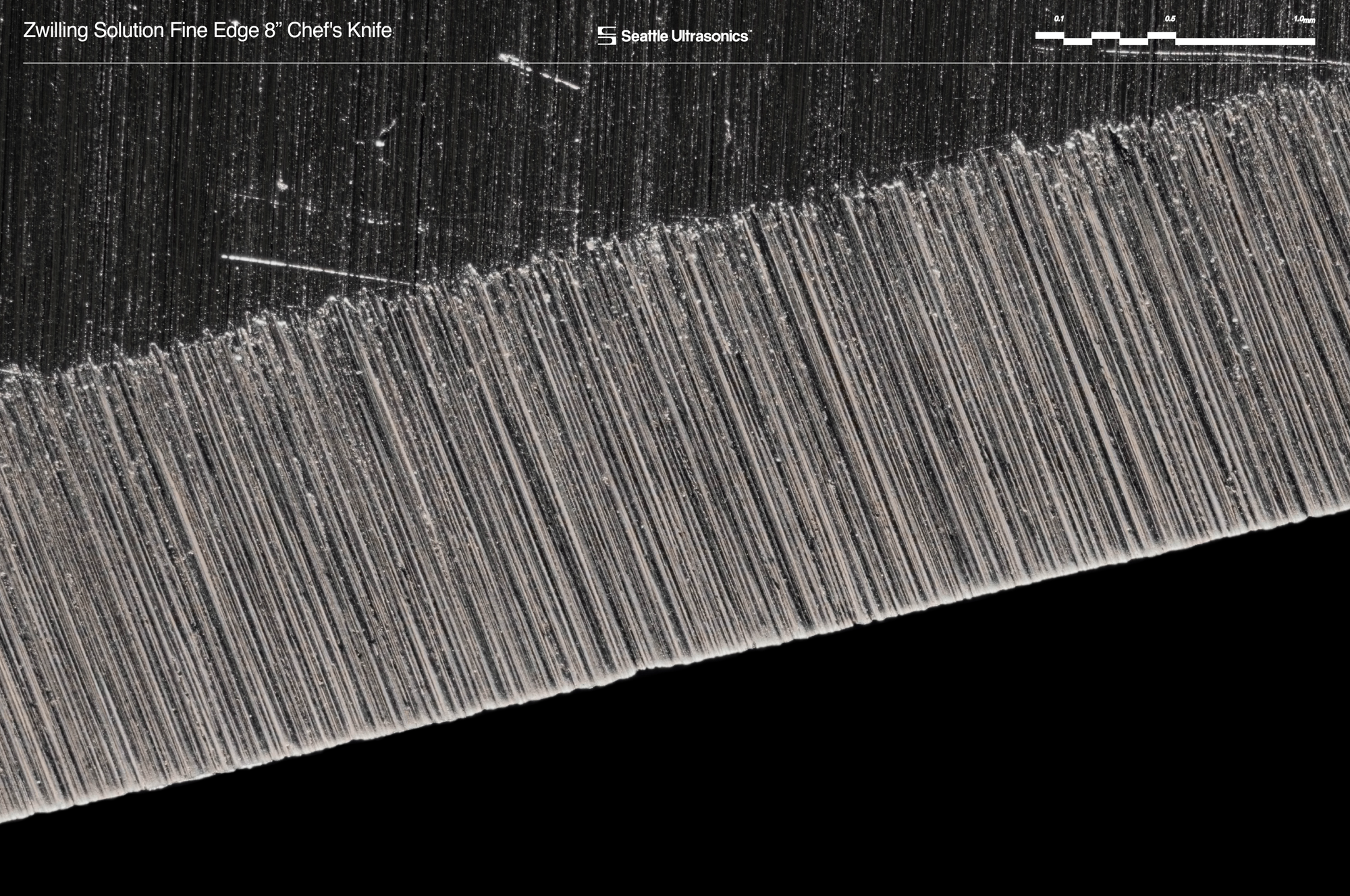 Each knife was photographed before use at high-magnification. These reveal features that indicate the quality of the blade’s construction, like the sharpness of the tip, the straightness of the choil, the evenness of the apex, and the smoothness of the sharpened edge. Learn more